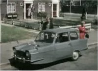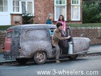 In many early episodes of Mr Bean a Reliant Regal 3/25 Super (Reg No: GRA 26K) appears and always ends up suffering on its side after being nudged by Mr Bean’s Mini. Various vehicles are used throughout the series though they always appear to be a Reliant Regal 3/25. I had an email from “Sidecar Jon” who wrote: in your 3 wheelers on telly page you mention the Mr Bean episode where the Reliant is forced to reverse and turns over. My mate Dan arranged that stunt!. He said they tried to get the thing to turn over by driving but found it surprisingly difficult. And they eventually resorted to a ram fitted under the car to shoot it over! The poor car ended up cut in four bits with an angle grinder and dumped in a skip!